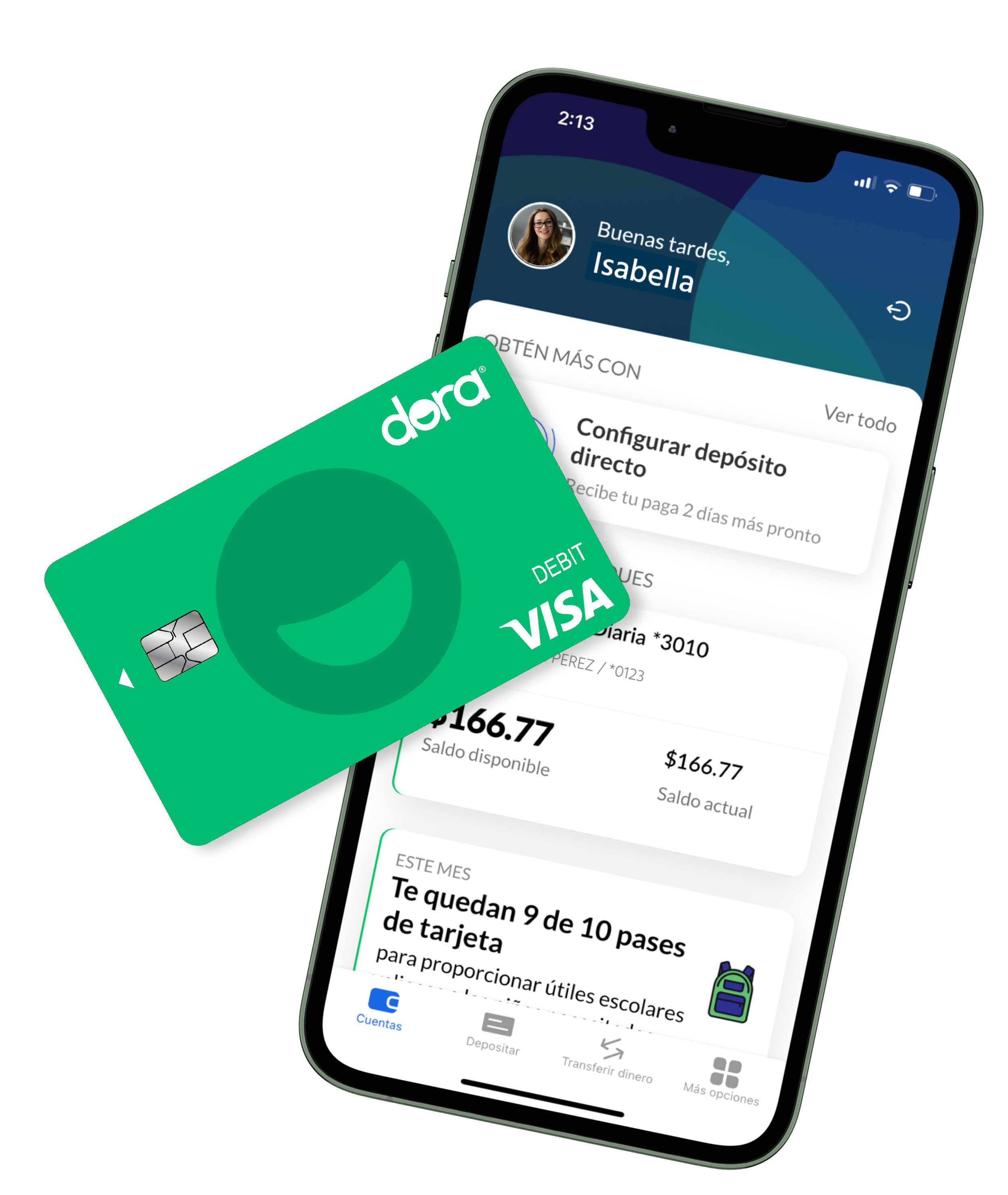 Obtén tu tarjeta de débito Visa® sin verificación de crédito y sin saldo mínimo, todo en la aplicación Dora.